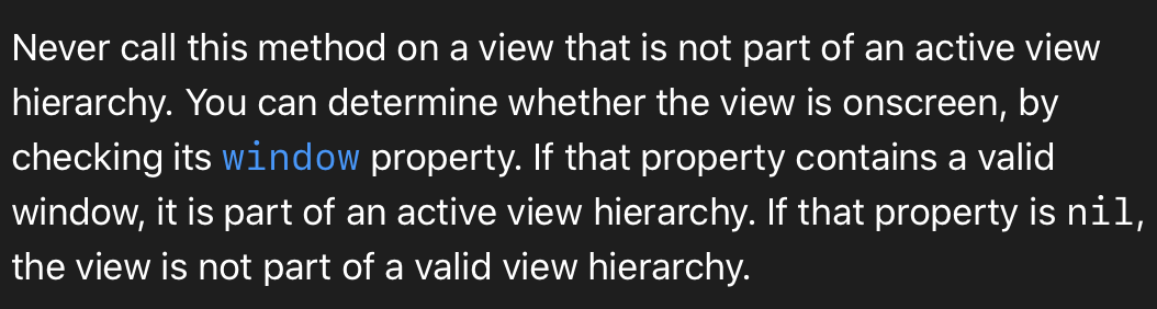 활성화된 뷰 계층에 속하지 않은(뷰 계층에 올라가지 않은) 뷰에서 이 메소드를 절대 부르지 마라!